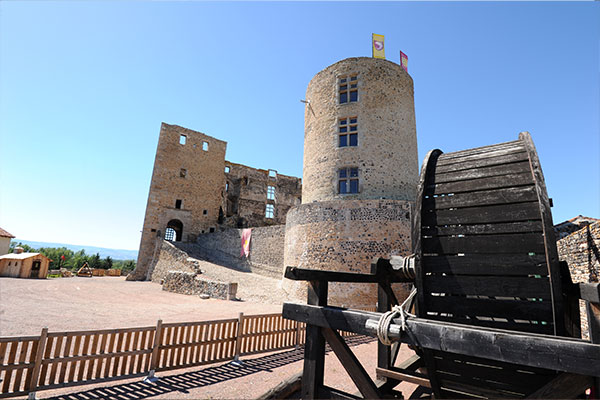 La salle est complétée par un espace extérieur, avec, en arrière-plan, le Château de Montrond.