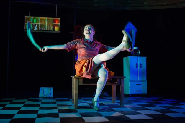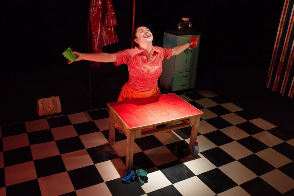 « Solo décalé et dansé pour 1 comédienne : ici, la cuisine. Une ménagère fait son entrée… ça rebondit, ça s’emboîte, ça glisse, ça coule ! “BALAIFARINEVERRESCHIFFONS” font bon ménage et ça déménage !! ».